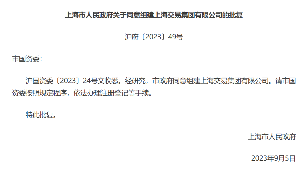 17:11【上海市人民政府同意组建上海交易集团有限公司】据上海政府网站消息,经研究,上海市政府同意组建上海交易集团有限公司。
