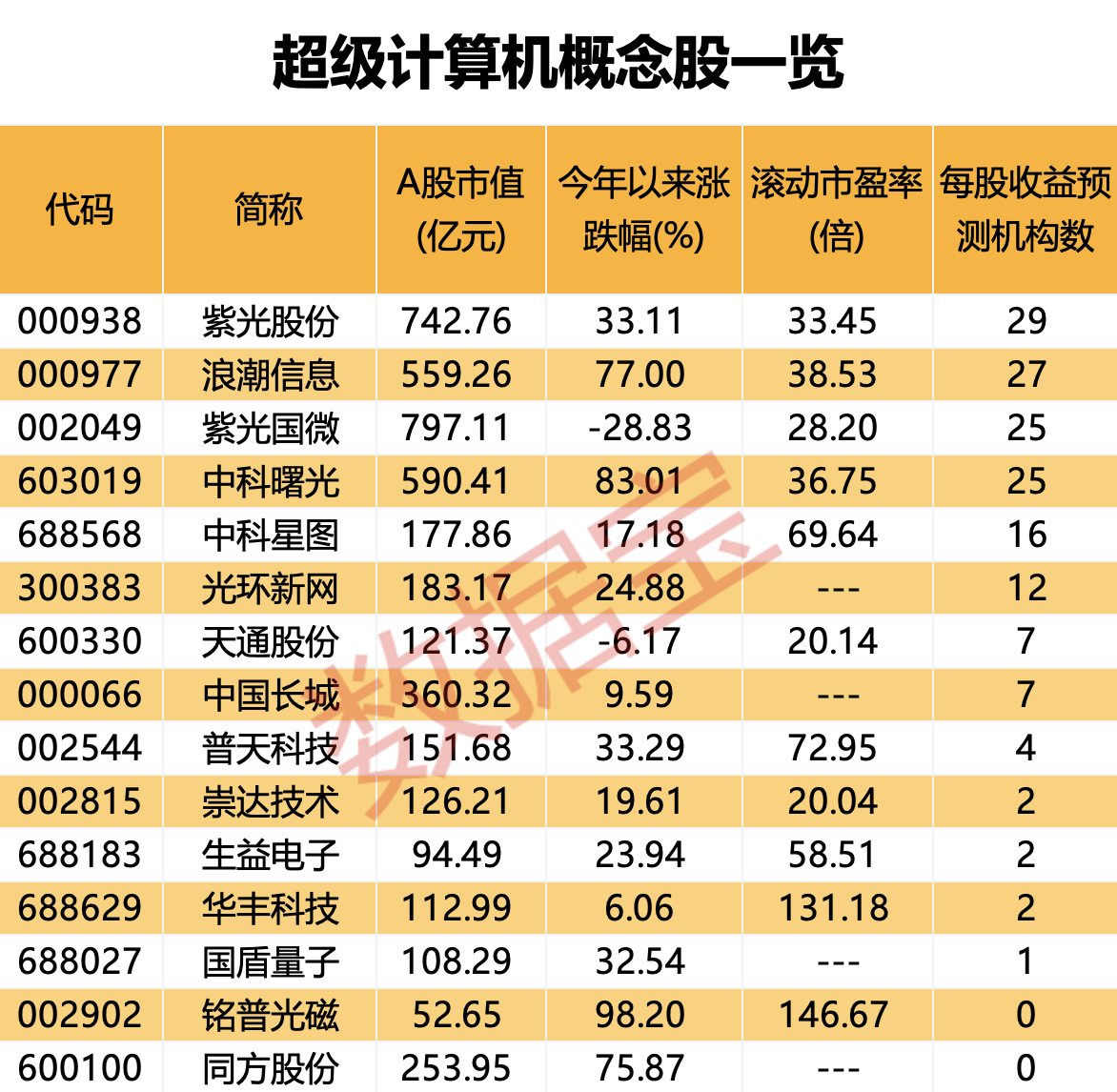 数据宝统计,截至9月11日收盘,超级计算机概念股合计A股市值超4400亿元。今年以来,这些概念股平均上涨33.29%,跑赢同期上证指数。铭普光磁、中科曙光、浪潮信息、同方股份、普天科技累计涨幅排在前五位。部分概念股获机构高度关注。数据宝统计,紫光股份、浪潮信息、中科曙光、紫光国微获20家以上机构给予“积极型”评级。紫光股份机构评级共29家,排在第一位。(数据宝)