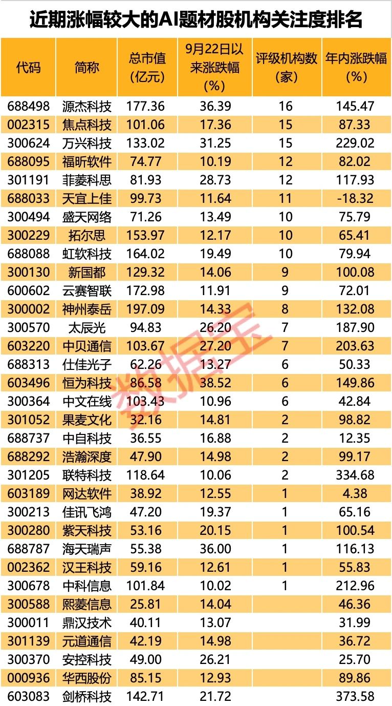 数据宝统计,9月22日以来,涨幅超过10%、且最新市值低于200亿元的个股中,有30多股属于人工智能相关题材。恒为科技、源杰科技、海天瑞声、万兴科技等涨幅超过30%;菲菱科思、中贝通信、安控科技、太辰光等涨幅超过20%。其中,恒为科技、菲菱科思、中贝通信等近期股价创出年内新高。从市值角度来看,熙菱信息、果麦文化、中自科技、网达软件等个股市值均不足50亿元。