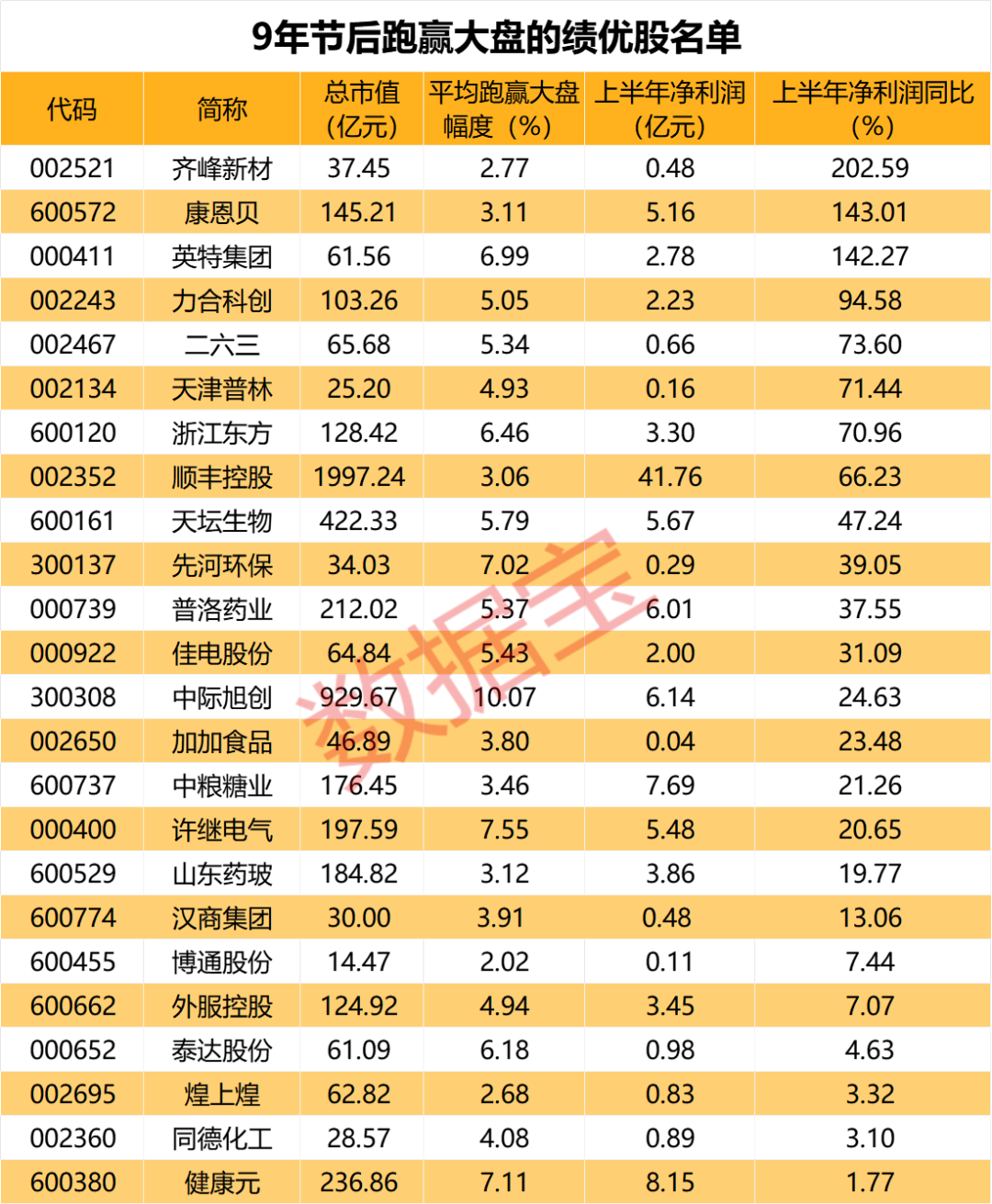 节后5日跑赢大盘概率超过90%的这些股中,包含天坛生物、健康元、普洛药业、许继电气等16只市值超百亿元的个股。中际旭创、同有科技、齐峰新材年内股价均累计上涨超50%。其中中际旭创年内累计上涨329.18%,涨幅居首,过去有9年国庆节后5个交易日行情表现跑赢大盘,平均跑赢大盘幅度为10.07%。24股上半年业绩同比呈现增长,其中齐峰新材、康恩贝、英特集团今年上半年归母净利润同比分别高达202.59%、143.01%和142.27%。这些上半年业绩呈现增长的个股,节后5日平均跑赢大盘幅度为5.01%。