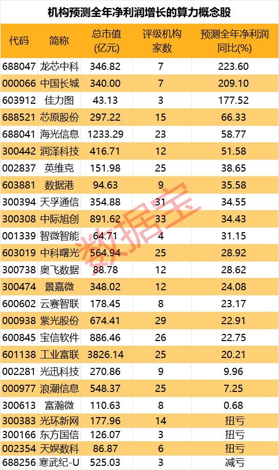 数据宝对AI算力指数进行了梳理。根据3家及以上机构一致预测,共计25股全年净利润增长。其中,龙芯中科、中国长城、佳力图有望翻倍,同比增幅依次为223.6%、209.1%、177.52%。同时,去年净利润规模在10亿元以上的工业富联、宝信软件、紫光股份、中科曙光和中际旭创,预计净利润同比增长均在20%以上。