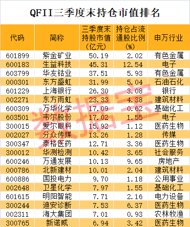 单只股票来看,三季度末QFII持仓市值超亿元的有111只。QFII持仓市值最高的是紫金矿业,期末持仓市值达到50.19亿元,公司为我国矿业龙头,今年前三季度营收达到2250亿元,创同期历史新高。