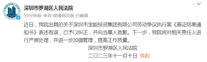 18:32【网传法院将拘留宝能姚振华?深圳市罗湖区人民法院回应】针对“姚振华或被深圳罗湖法院拘留”的网传消息,深圳市罗湖区人民法院官方微博于11月10日下午发布情况说明:近日,我院出具的关于深圳市宝能投资集团有限公司劳动争议执行案《查证结果通知书》表述有误,已予以纠正,并向当事人致歉。下一步,我院将对相关责任人进行严肃处理,并进一步加强管理,提高工作质量。