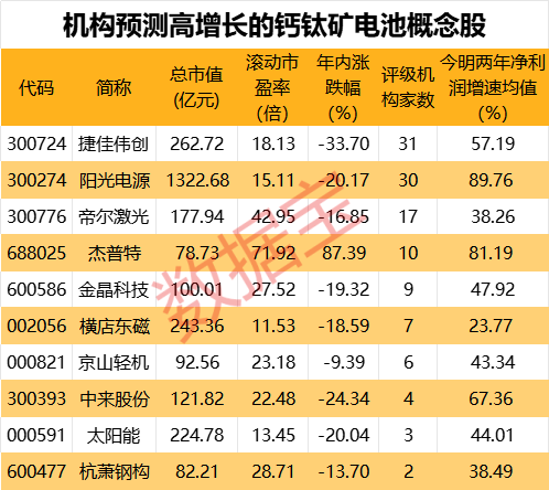 数据宝统计,A股中布局钙钛矿电池的共有17股,合计总市值4955亿元,其中隆基绿能1783.11亿元、阳光电源1322.68亿元。二级市场概念股表现不佳,今年以来仅杰普特、金信诺、万润股份3股录得上涨;龙头隆基绿能大跌43.57%,捷佳伟创跌幅33.7%,阳光电源、中来股份、聆达股份、太阳能均跌幅超20%。估值方面,京山轻机、阳光电源、横店东磁、隆基绿能、日出东方等11股最新滚动市盈率不足30倍,其中日出东方仅11.43倍。业绩方面,今年前三季度钙钛矿电池概念股净利润普遍正增长,日出东方实现净利润1.7亿元,同比增幅达11.14倍;阳光电源实现净利润72.23亿元,同比增幅达250.53%。