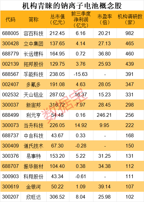 数据宝统计,截至11月14日收盘,A股钠离子电池概念股43只。今年以来,参与调研的机构家数超百家的概念股有17只。其中982家机构参与调研容百科技,位居第一;其次立中集团、长远锂科、拓邦股份、孚能科技、多氟多、天山铝业接受超过300家的机构调研。