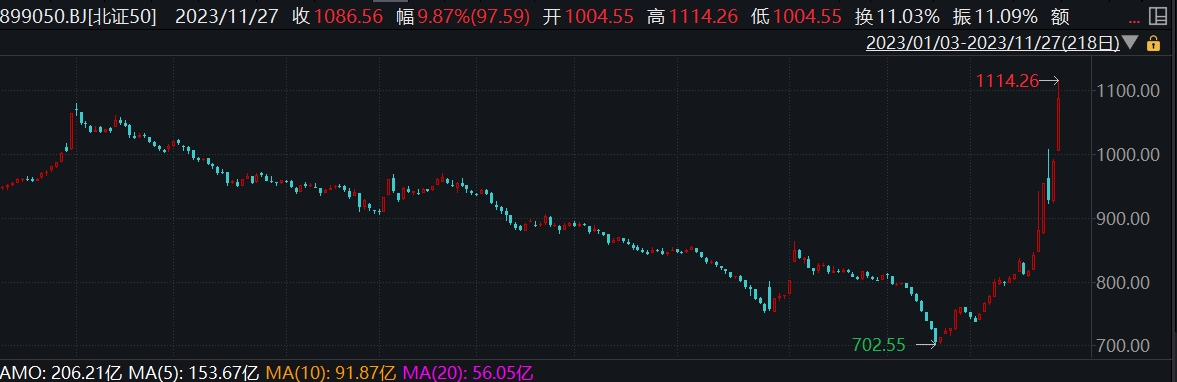 12:44【北交所行情持续 “火爆” 北证50指数突破年内新高】今日早盘,北交所行情持续 “火爆”。北证50指数盘中一度涨超12%,创年内新高,日内最高报1114.26,指数个股成交额超200亿元。