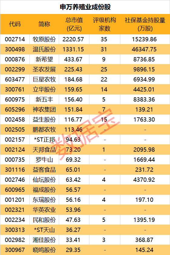 从三季度末社保基金持仓来看,温氏股份、牧原股份持股量居前,分别为4.63亿股、1.52亿股;圣农发展、新希望和新五丰的社保基金持股量也均在8000万股以上。从社保基金持股量占流通股比例来看,巨星农牧、新五丰、温氏股份、圣农发展排名前四,依次为13.7%、12.84%、8.53%、8.04%。(数据宝)