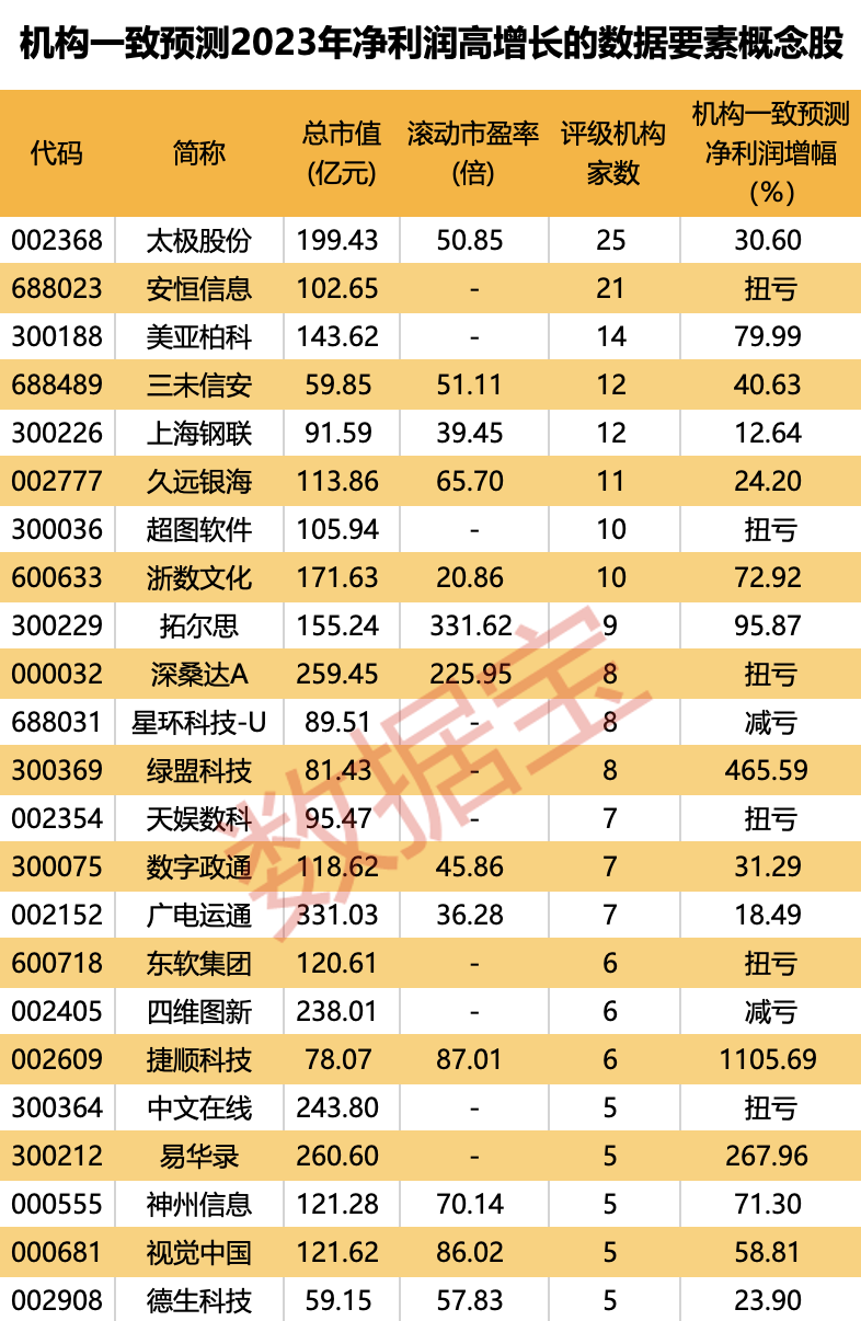 根据5家及以上机构一致预测,捷顺科技、绿盟科技、易华录今年全年净利润有望实现翻倍增长,同比增幅依次为1105.69%、465.59%、267.96%;以上三家公司2022年同期利润均低于3000万元。在2022年净利润超亿元的公司中,机构一致预计拓尔思、美亚柏科、浙数文化、神州信息今年净利润增幅有望居前,依次为95.87%、79.99%、72.92%、71.3%。(数据宝)