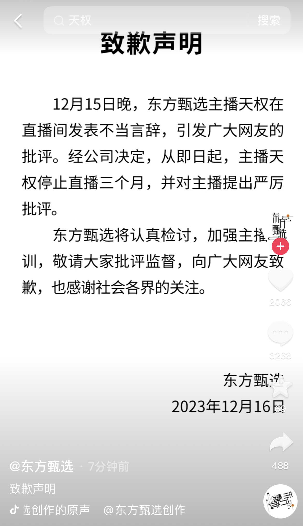 16:14【东方甄选发布致歉声明:主播天权停播三个月】东方甄选发布致歉声明:12月15日晚,东方甄选主播天权在直播间发表不当言辞,引发广大网友的批评。经公司决定,从即日起,主播天权停止直播三个月,并对主播提出严厉批评。东方甄选将认真检讨,加强主播培训,敬请大家批评监督,向广大网友致歉,也感谢社会各界的关注。