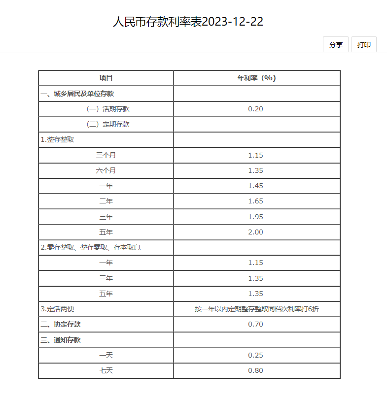 08:17【中国银行宣布下调人民币存款利率】中国银行官网显示,该行于12月22日下调人民币存款利率,其中定期整存整取三个月、半年和一年期利率均下调10个基点,一年期利率降至1.45%;二年期下调20个基点至1.65%;三年期和五年期均下调25个基点,分别至1.95%和2.00%。零存整取、整存零取、存本取息利率下调10个基点,通知存款挂牌利率下调20个基点。