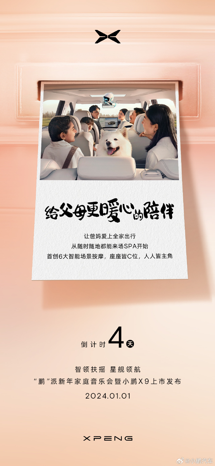 【小鹏汽车:将在2024年第一天正式发布小鹏X9】据小鹏汽车官博消息,将在2024年第一天正式发布明日星舰小鹏X9。