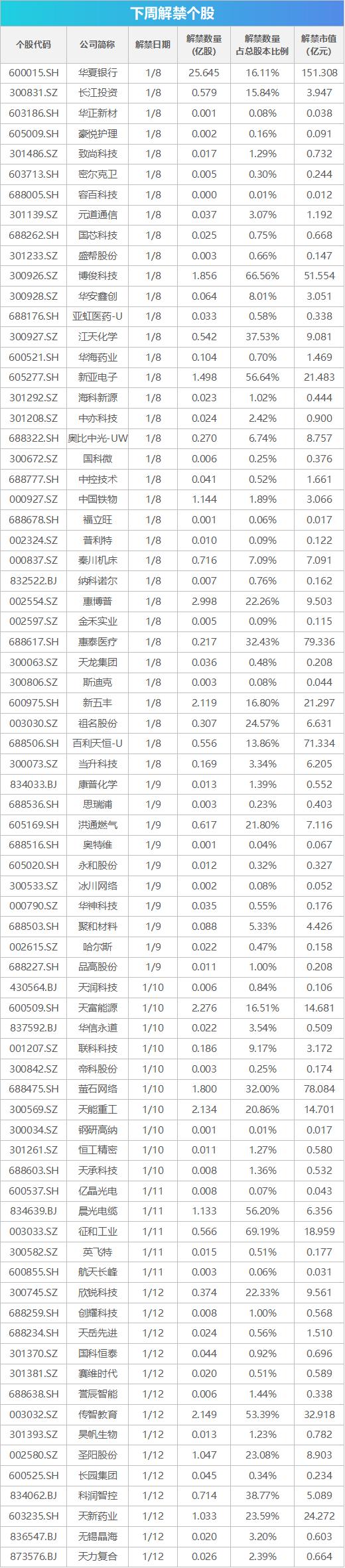 下周共有74家公司限售股陆续解禁,合计解禁53.56亿股,按最新收盘价计算,解禁总市值为700.96亿元。