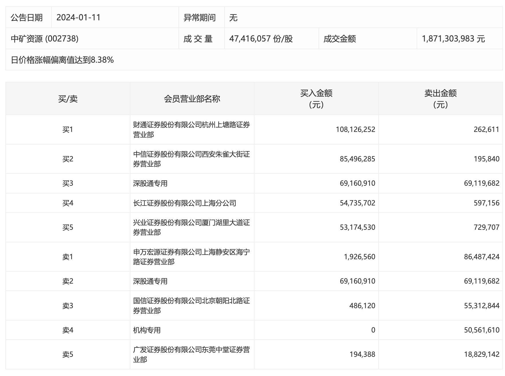 16:27【中矿资源涨停 上塘路席位净买入1.08亿元】中矿资源今日涨停,成交额18.71亿元,换手率6.60%,盘后龙虎榜数据显示,上塘路席位净买入1.08亿元,深股通专用席位买入6916.09万元并卖出6911.97万元,一机构专用席位净卖出5056.16万元。