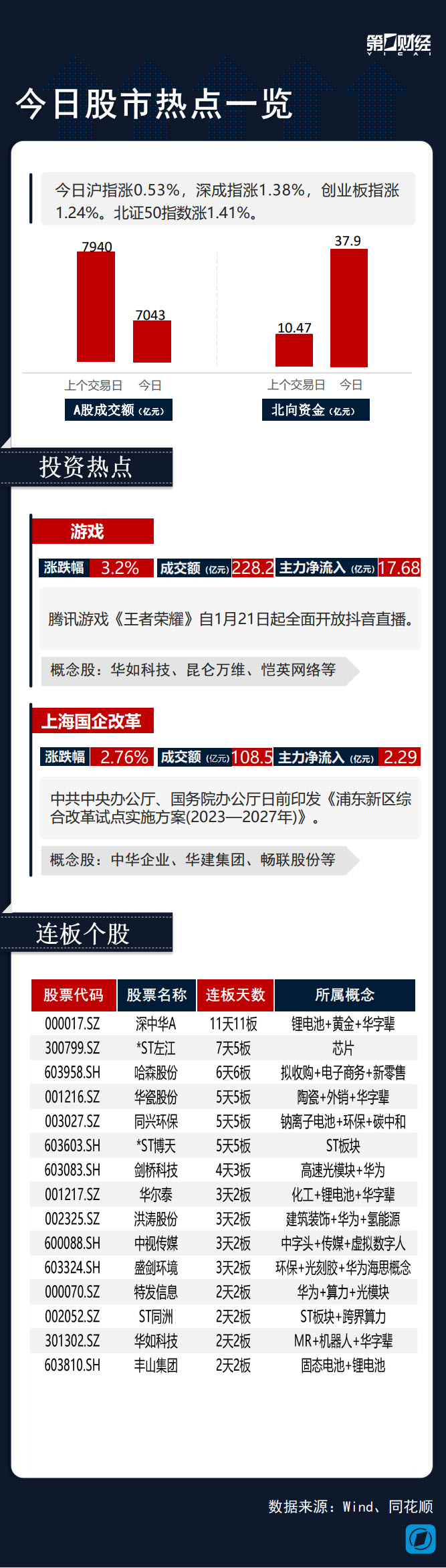 板块方面,游戏板块迎来大涨,腾讯游戏《王者荣耀》自1月21日起全面开放抖音直播;上海国企改革概念活跃,中共中央办公厅、国务院办公厅日前印发《浦东新区综合改革试点实施方案(2023—2027年)》。