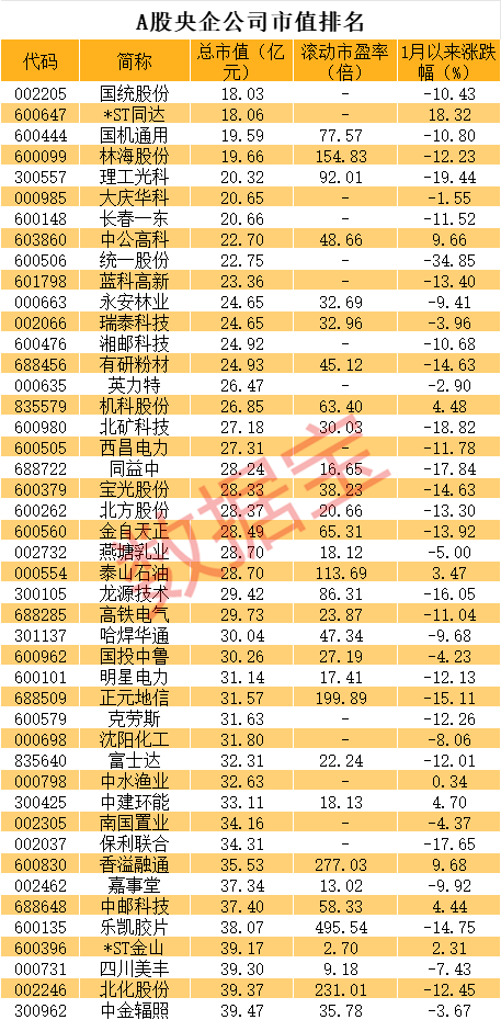 梳理出当前市值低于40亿元的央企股票,合计共有45只。其中市值较低的是国统股份和*ST同达,均不足19亿元。