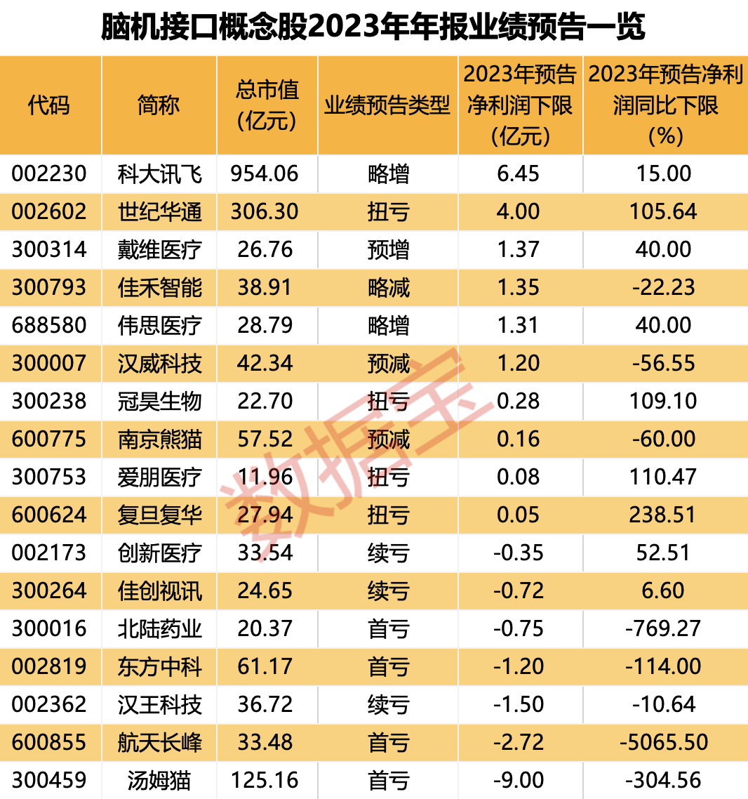 目前脑机概念股中,有17股已发布2023年全年业绩预告,爱朋医疗、冠昊生物、复旦复华、世纪华通4股业绩预计扭亏;戴维医疗、伟思医疗、科大讯飞业绩预计同比呈现增长,其中科大讯飞的净利润规模居首,预测净利润约6.45亿元—7.3亿元,较去年同期变化约为15%—30%。(数据宝)