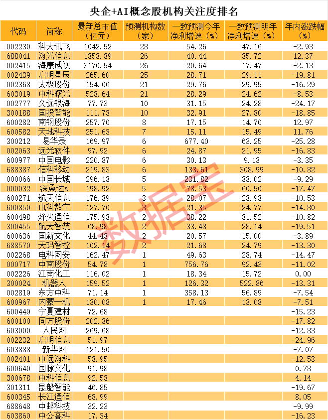 据统计,A股具有人工智能概念的央企合计有40家,海康威视、海光信息、科大讯飞等公司市值超过千亿元,中科曙光、中国长城、人民网等公司市值超过百亿元。规模最小的是中公高科,不足20亿元。机构关注度较高的个股也集中在龙头企业,科大讯飞、海康威视、海光信息等千亿龙头均有20多家机构评级。