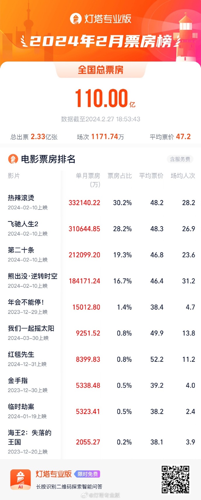 18:59【2024年2月电影票房破110亿 本月票房进入影史单月票房TOP3】据灯塔专业版数据,截至2月27日18时53分,2024年2月总票房(含预售)破110亿。《热辣滚烫》《飞驰人生2》《第二十条》暂列本月票房前三位。 本月票房也成为当前中国影史单月票房第三位。