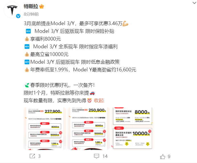 09:09【特斯拉:3月底前提走Model 3/Y,最多可享优惠3.46万】特斯拉官博宣布,Model3/Y后驱版现车限时保险补贴,享福利8000元;Model3/Y全系现车限时指定车漆福利,最高省10000元;Model3/Y后驱版现车限时低息金融政策,年费率低至1.99%,ModelY最高省约16,600元。