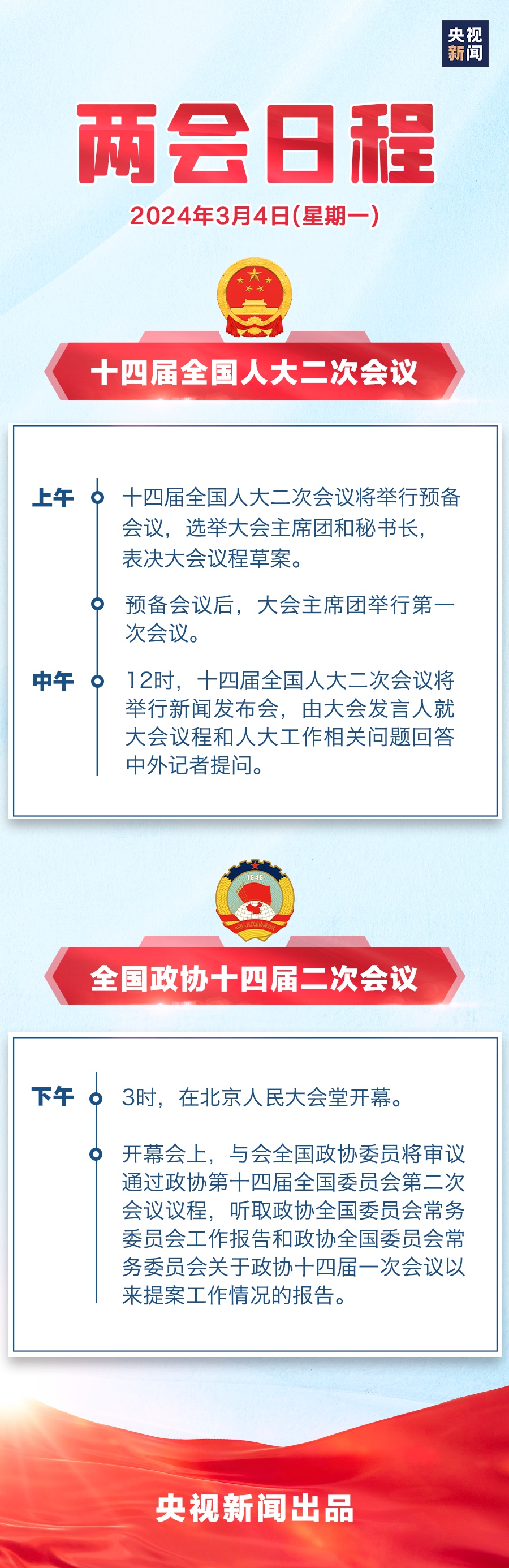 09:13【两会日程预告丨全国政协十四届二次会议4日下午3时开幕】全国政协十四届二次会议将于3月4日下午3时在北京人民大会堂开幕。开幕会上,与会全国政协委员将审议通过政协第十四届全国委员会第二次会议议程,听取政协全国委员会常务委员会工作报告和政协全国委员会常务委员会关于政协十四届一次会议以来提案工作情况的报告。(央视新闻)