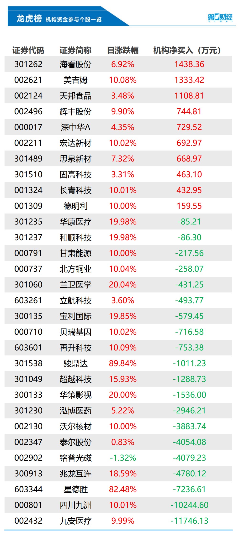 当天机构净买入前三的股票分别是海看股份、美吉姆、天邦食品,净买入金额分别是1438万元、1333万元、1109万元。