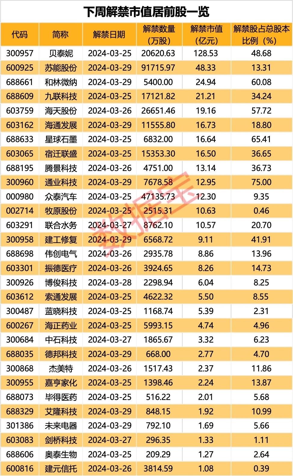 08:59【下周解禁市值居前股出炉,这些股亏损规模较大(附股)】下周将有54股解禁,按照最新收盘价计算,合计解禁总市值达427.95亿元。贝泰妮、苏能股份、和林微纳、九联科技解禁市值居前。贝泰妮解禁市值规模最大,下周将有2.06亿股上市流通,主要为首发原股东限售股份,解禁市值达128.53亿元。苏能股份的解禁规模次之,下周将有9.17亿股上市流通,解禁股主要为首发原股东限售股份,解禁市值达48.33亿元。