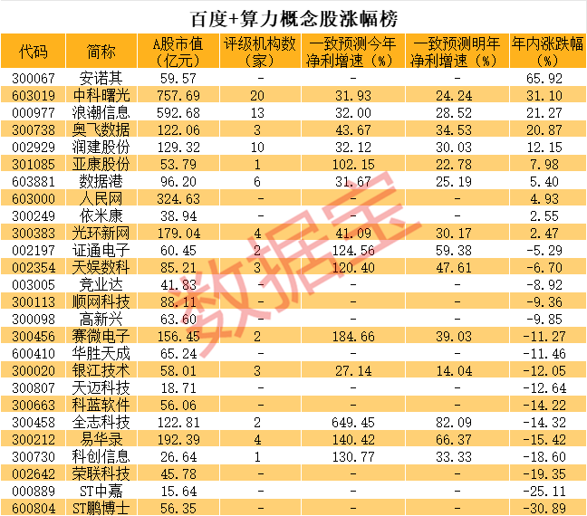 A股市场上同时有百度和算力概念的个股合计有26只。从市值角度来看,中科曙光、浪潮信息、人民网、易华录等个股市值超过百亿元。市值较低的个股主要有ST中嘉、天迈科技、依米康、科创信息等,均不足50亿元。机构关注度较高的个股主要有中科曙光、浪潮信息、润建股份等,均有10家及以上机构评级。市场表现来看,年内涨幅最大的个股是安诺其,接近66%。此外,中科曙光和浪潮信息等个股年内均大涨超20%。