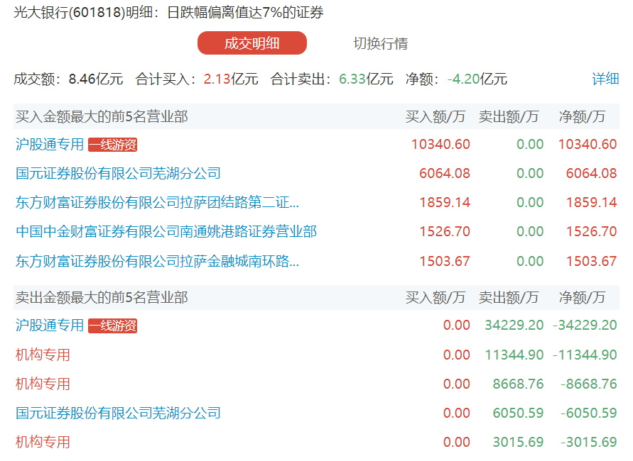 17:24【光大银行今日跌7.14% 三机构净卖出2.3亿元】光大银行今日跌7.14%,成交额19.43亿元,换手率1.35%,盘后龙虎榜数据显示,沪股通专用席位买入1.03亿元并卖出3.42亿元,三机构净卖出2.3亿元。