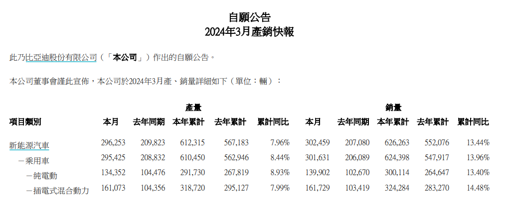 18:37【比亚迪:3月新能源汽车销量302459辆】比亚迪在港交所公告,2024年3月新能源汽车销量302459辆。
