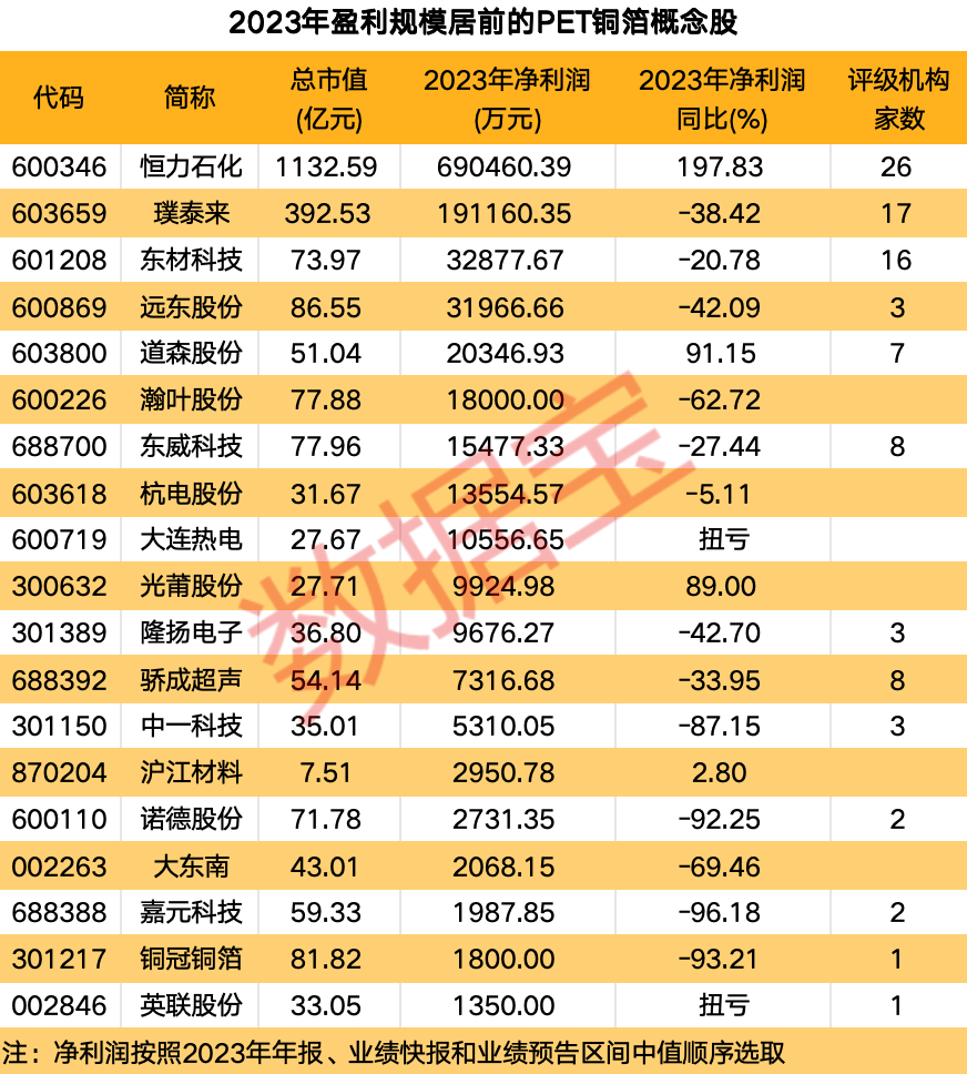 截至目前,在已发布年报相关报告的上市公司中,共计19家全年净利润规模在1000万元以上。恒力石化、璞泰来居前,净利润规模依次为69.05亿元、19.12亿元。从机构关注度来看,恒力石化、璞泰来、东材科技、东威科技、骄成超声、道森股份排名靠前,依次有26家、17家、16家、8家、8家、7家机构参与公司评级。(数据宝)