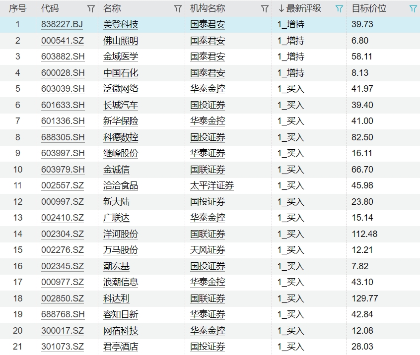 16:26【机构今日看好这些个股】5月7日,截至发稿,机构共给出91次最新买入评级,其中21只个股目标价获公布:-中国石化获国泰君安增持评级,目标价为8.13元;-浪潮信息获华泰金控青睐,目标价为43.1元;-洋河股份、金域医学、潮宏基等多股在列。