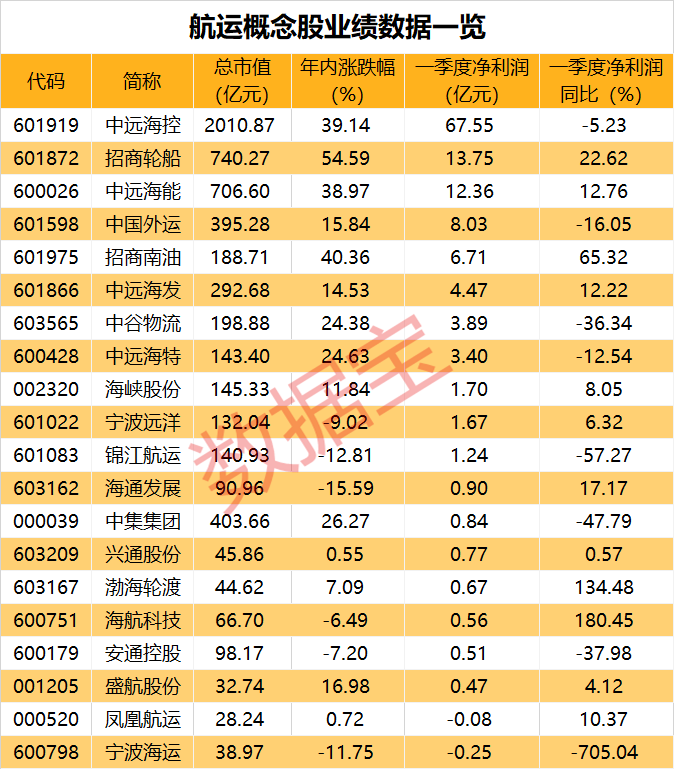 据统计,A股中,航运概念股有20只,年内平均上涨12.65%,跑赢大盘;招商轮船、招商南油、中远海控、中远海能年内股价均上涨超30%。一季度中,超半数航运概念股业绩盈利且同比呈现增长,其中海航科技、渤海轮渡、招商南油的净利润同比增长幅度居前,分别增长180.45%、134.48%和65.32%。