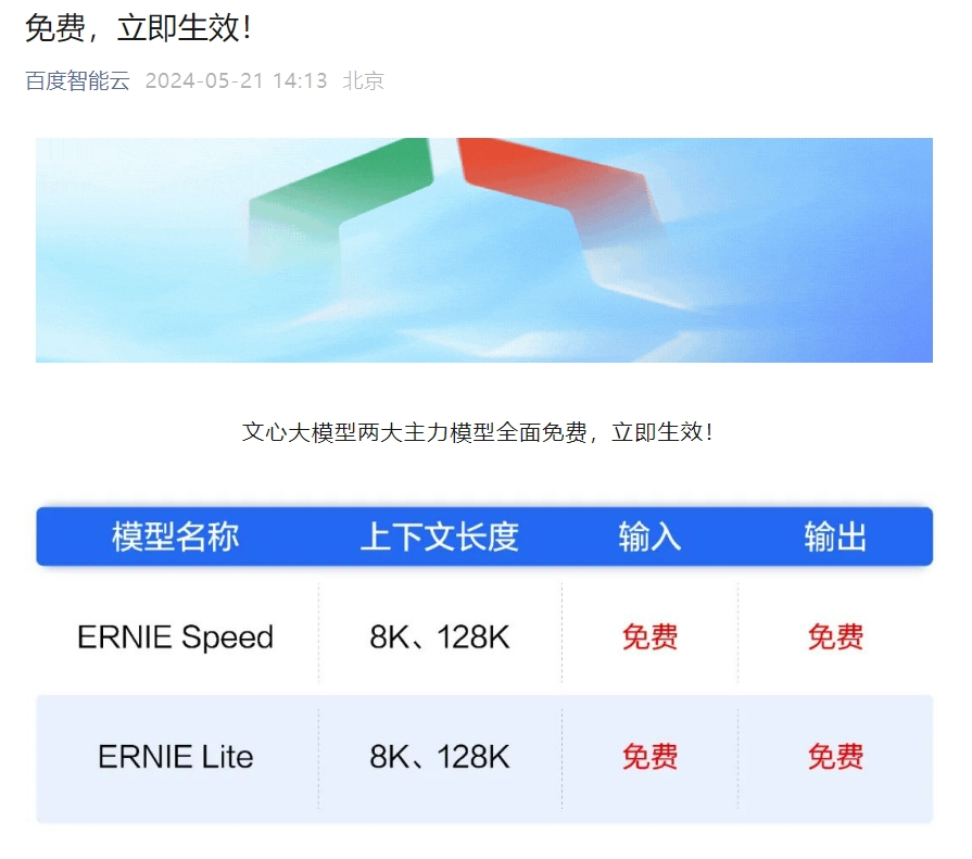 14:29【百度文心大模型两大主力模型官宣免费】百度智能云宣布百度文心大模型的两款主力模型ERNIE Speed、ERNIE Lite全面免费,即刻生效。