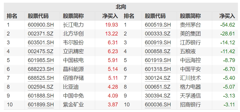 21:45【北向资金近七日买卖这些个股 贵州茅台遭净卖出超54亿元】据Wind数据,北向资金近七日大幅净买入长江电力、北方华创、韦尔股份,净买入额分别为19.93亿元、13.22亿元、6.31亿元;贵州茅台、美的集团、江苏银行遭净卖出规模居前,金额分别为54.62亿元、28.61亿元、14.12亿元。