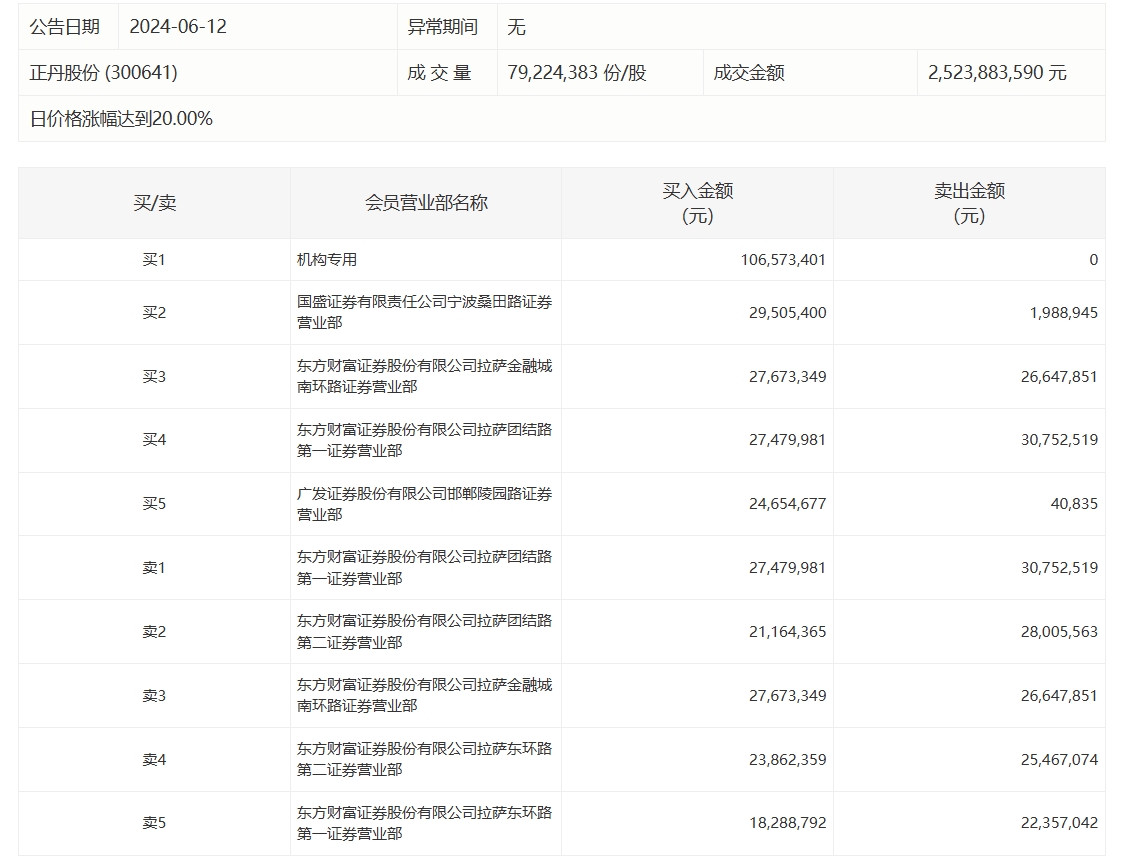 16:32【正丹股份今日20%涨停 一机构净买入1.07亿元】正丹股份今日20%涨停,成交额25.24亿元,换手率15.59%。盘后龙虎榜数据显示,一机构专用席位净买入1.07亿元,卖方前五均为“散户大本营”席位。