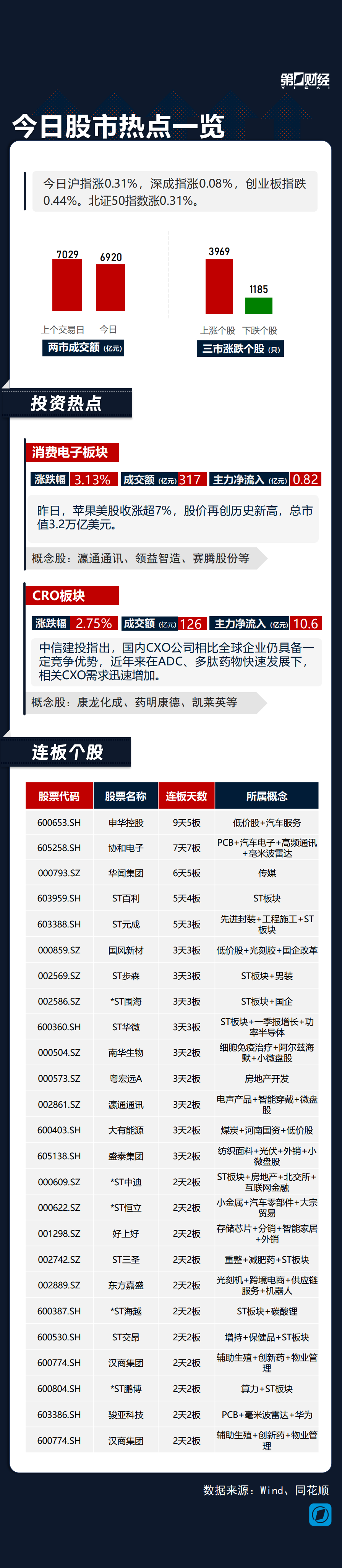 板块方面,消费电子板块表现强势,昨日,苹果美股收涨超7%,股价再创历史新高,总市值3.2万亿美元;CRO概念涨幅居前,中信建投指出,国内CXO公司相比全球企业仍具备一定竞争优势,近年来在ADC、多肽药物快速发展下,相关CXO需求迅速增加。