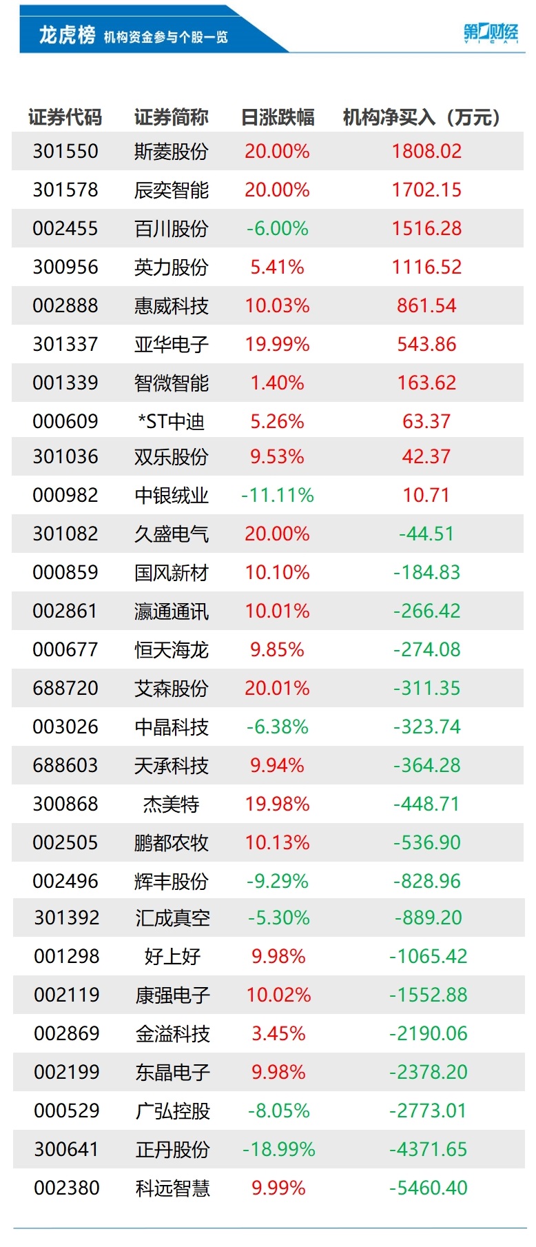 当天机构净买入前三的股票分别是斯菱股份、辰奕智能、百川股份,净买入金额分别是1808万元、1702万元、1516万元。