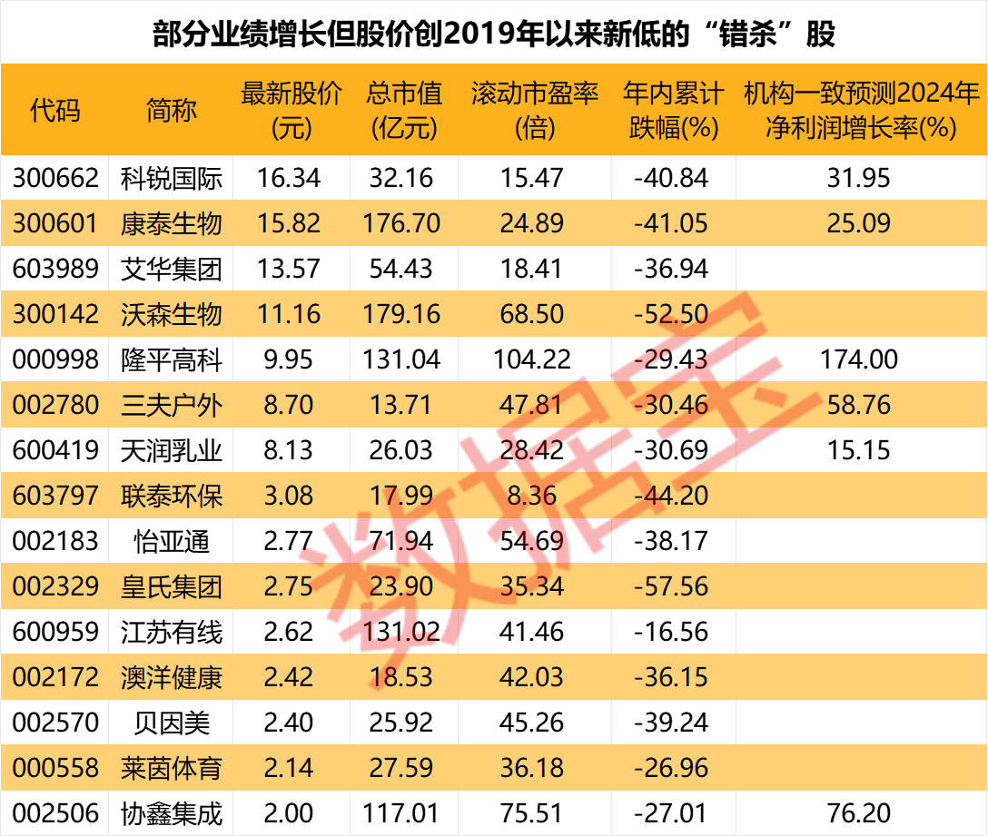 经梳理,共计15股满足上述要求。这些业绩增势还不错的个股年内均经历了“大跌”。其中江苏有线跌幅最小,有16.56%;科锐国际、康泰生物、联泰环保年内跌幅超过40%;沃森生物、皇氏集团跌幅在50%以上。