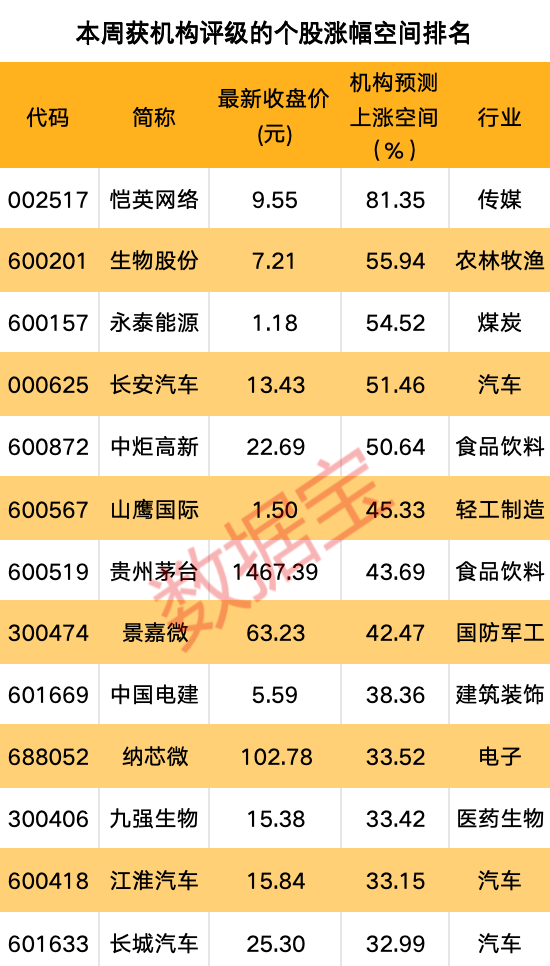 获2家及以上机构评级的个股中,13股最新收盘价较机构一致预测目标价上涨空间超30%,其中恺英网络涨幅有望超80%。(数据宝)