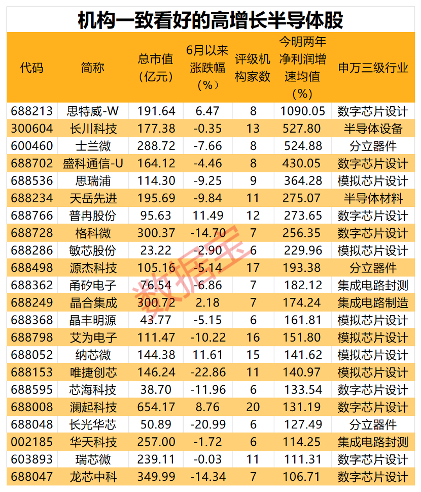 截至目前,申万半导体行业个股中,韦尔股份、澜起科技、佰维存储、南芯科技发布了上半年业绩预告,且以业绩下限来看,业绩增幅均超100%。根据5家以上机构一致预测,22股今明两年净利润增速均值有望翻倍。(数据宝)