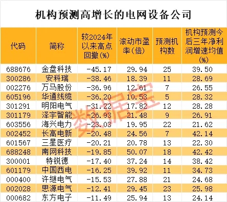 在未来增长潜力方面,根据5家及以上机构一致预测,2024年—2026年净利润增速均有望超20%的电网设备公司有15家。机构预测净利润增速均值最高的是南网科技,达到42.42%。估值水平来看,上述15家公司最新滚动市盈率普遍在30倍以下。华通线缆、万马股份、明阳电气、安科瑞、海兴电力滚动市盈率不到20倍。华通线缆滚动市盈率为10.53倍,排在最低位置。最新收盘价与年内高点相比,5家公司股价回撤幅度在30%以上,分别是金盘科技、安科瑞、万马股份、华通线缆、明阳电气。(数据宝)