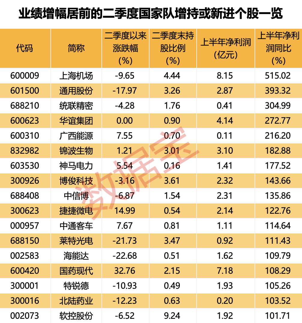 二季度获得国家队新进持股的有68股,山金国际、新钢股份、龙佰集团、伟星股份等19股的新进股数均超千万股,其中诺瓦星云、莱特光电、千金药业、安科瑞、伟星股份的国家队持股比例居前。