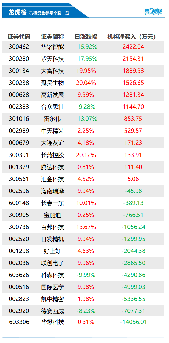 当天机构净买入前三的股票分别是华铭智能、紫天科技、大富科技,净买入金额分别是2422万元、2154万元、1890万元。