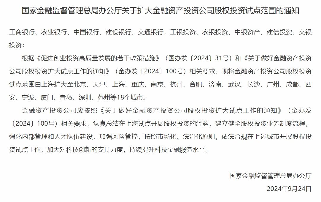 20:58【国家金融监督管理总局:将金融资产投资公司股权投资试点范围扩大至18个城市】据国家金融监督管理总局网站消息,国家金融监督管理总局办公厅发布关于扩大金融资产投资公司股权投资试点范围的通知,其中提出,将金融资产投资公司股权投资试点范围由上海扩大至北京、天津、上海、重庆、南京、杭州、合肥、济南、武汉、长沙、广州、成都、西安、宁波、厦门、青岛、深圳、苏州等18个城市。