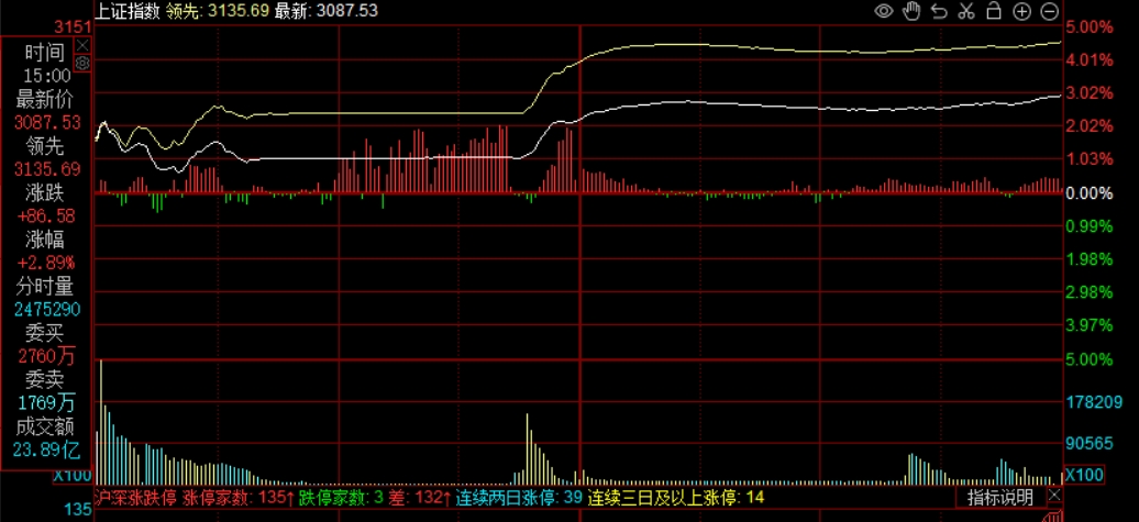 15:01【A股收盘|上证指数涨2.89% 白酒股大涨】三大股指今日集体收涨,上证指数报收3087.53点,涨2.89%,深成指报收9514.86点,涨6.71%,创业板指报收1885.49点,涨10.0%。能源金属、白酒、光伏设备、券商、软件开发、电池等板块大涨,鸿蒙、互联网保险板块涨幅居前。A股成交额达1.46万亿元。全市场超5200只个股上涨,逾百股涨停,仅96只个股下跌。(第一财经AI快讯)