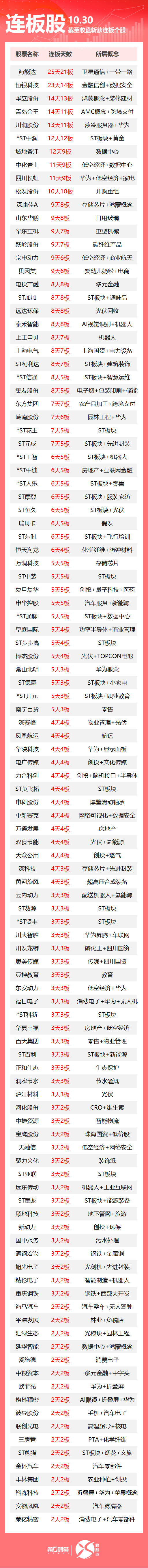 16:42【热市追踪丨A股今日共194只个股涨停 *ST中润斩获12连板】10月30日,Wind数据显示,A股市场共计194只个股涨停。其中卫星通信概念股海能达收获25天21板,黄金概念股*ST中润12连板,家电板块四川长虹11天9板,农业板块东方集团7连板。一图速览今日连板股>>