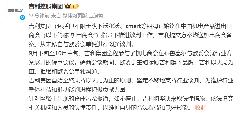21:21【吉利集团声明:从未私自与欧委会单独进行沟通谈判】吉利控股集团发布声明称,吉利集团(包括但不限于旗下沃尔沃、smart等品牌)始终在中国机电产品进出口商会指导下推进谈判工作,吉利提交方案均送机电商会备案,从未私自与欧委会单独进行沟通谈判。9月下旬至10月中旬,吉利集团全程参与了机电商会在布鲁塞尔与欧委会就行业方案展开的磋商会谈。磋商会谈期间,欧委会主动接触吉利旗下品牌,吉利以大局为重,拒绝和欧委会单独沟通。针对网络上出现的歪曲污蔑报道,如不停止,吉利将坚决采取法律措施,依法追究相关机构和人员的法律责任,以维护自身的合法权益和良好形象。