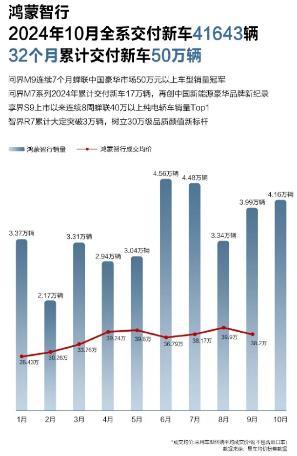 17:49【鸿蒙智行:10月全系交付新车41643辆】鸿蒙智行公布10月交付数据。2024年10月,鸿蒙智行全系交付新车41643辆。问界M9 10月交付16004辆,发布10个月累计大定突破16万辆。问界M7系列10月交付15836辆。智界R7 10月交付4730辆。