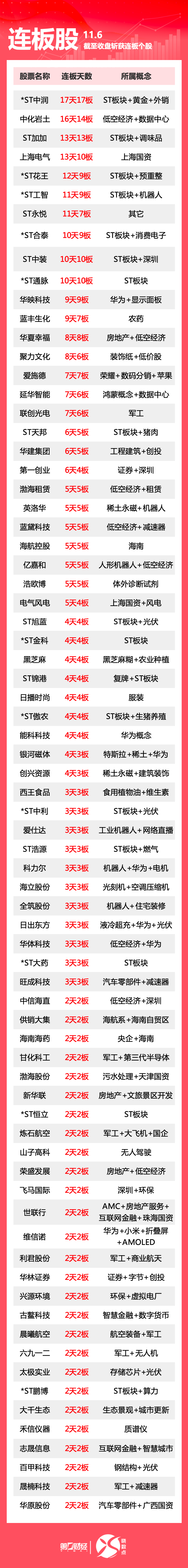 15:36【热市追踪丨A股今日共180只个股涨停 *ST中润17连板】11月6日,Wind数据显示,A股市场共计178只个股涨停。黄金股*ST中润收获17连板,华为概念股华映科技9连板,地产股华夏幸福8连板,ST板块多股连板。一图速览今日连板股>>
