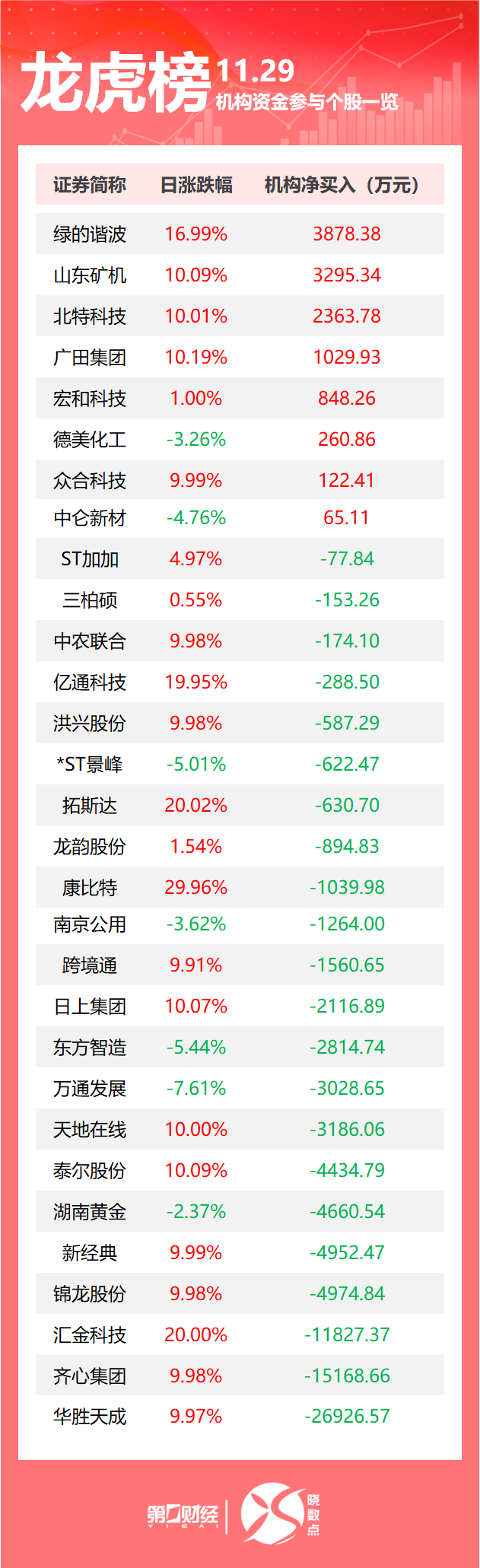 当天机构净买入前三的股票分别是绿的谐波、山东矿机、北特科技,净买入金额分别是3878万元、3295万元、2364万元。